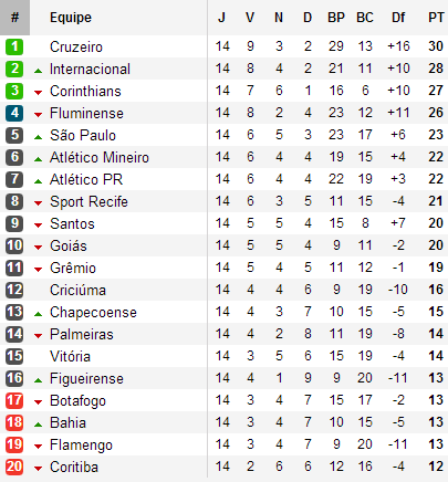 Derrière, les Corinthians, à trois points de Cruzeiro, sont toujours talonnés par Fluminense malgré le nul concédé lors de la 14e journée face à la lanterne rouge Coritiba. Suit ensuite São Paulo. Le Tricolor s’appuie sur le duo Alan Kardec – Alexandre Pato pour enfin décrocher un succès après trois matchs sans victoire et conserve son point d’avance sur les deux Atlético : Mineiro et Paranaense.