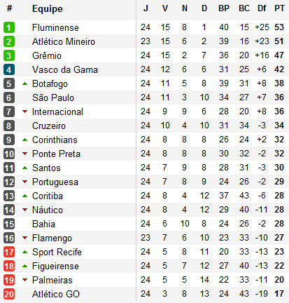 Conséquence, le duo de tête s’échappe. Car derrière, si Grêmio s’est imposé lors de la 24e journée face à Náutico, le Tricolor était tombé quelques jours plus tôt face aux Corinthians. Les hommes de Luxemburgo sont désormais relégués à quatre points de l’Atlético Mineiro qui compte encore un match de retard mais conserve sa troisième place, Vasco ne profitant pas de l’occasion pour se rapprocher.
