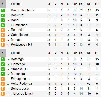 Tout va bien pour les deux finalistes du dernier championnat carioca, Vasco et Botafogo avec cinq victoires chacun en autant de matchs. Un but de Thalles et un but WTF de Nenê ont permis au Vasco de s'imposer 2-0 et d'être la première équipe qualifiée pour le second tour (les quatre premiers de chaque groupe s'affronteront entre eux). Nenê, déjà quatre buts dans le championnat, sera suspendu pour le prochain match après un troisième carton jaune reçu depuis le début de la compétition. Ce fut un peu plus compliqué pour le Botafogo de Ricardo Gomes qui a dû attendre la dernière minute et un but de Neilton, qui effectuait son premier match de l'année après une blessure, pour s'imposer face à Cabofriense.
