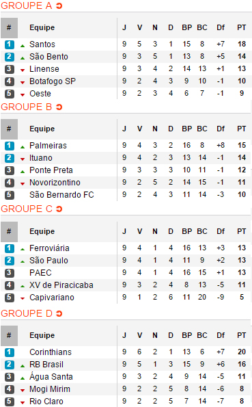 Le système du championnat épargne les grands puisque deux équipes sont qualifiées par groupe et les quatre grands clubs sont partagés entre les quatre groupes. Le Corinthians se balade dans son groupe avec 20 points en neuf journées. Même avec une équipe bis, le Corinthians a facilement disposé du Botafogo-SP sur le score de 3-0 afin de prendre neuf points d'avance sur le troisième de son groupe. Tout va bien pour Santos également, auteur d'une courte victoire samedi avec à nouveau un bon match de Lucas Lima et Gabriel Barbosa. Le Peixe compte cinq points d'avance sur Linense, actuellement troisième du groupe A.
