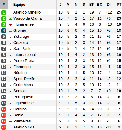 Reste que le retard sur les leaders est conséquent. Car devant, l'Atlético Mineiro domine un Internacional réduit à 10 avant la pause suite à l'expulsion d'Andres d'Alessandro et conforte sa première place. Dans sa roue, Vasco s'impose au Morumbi devant São Paulo et reste accroché. Les deux leaders profitent de cette 10e journée pour creuser l'écart avec les poursuivants en attendant le résultat de Fluminense ce soir. Le nouveau quatrième se nomme Grêmio qui écrase Sport et mène désormais la chasse.