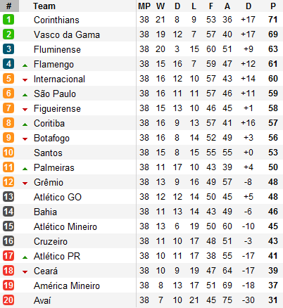 Autre point chaud de la journée, le derby de Bello Horizonte entre Cruzeiro et Atlético Mineiro, duel pour la survie de la Raposa, la Sudamericana pour le Galo. En humiliant son principal rival (6-1), le décevant Cruzeiro sauve sa peau et offre enfin du bonheur à ses supporters en privant l’Atlético Mineiro d’une place en Sudamericana. Car dans le même temps, Bahia prenait le dessus sur Ceará et doublait le Galo.