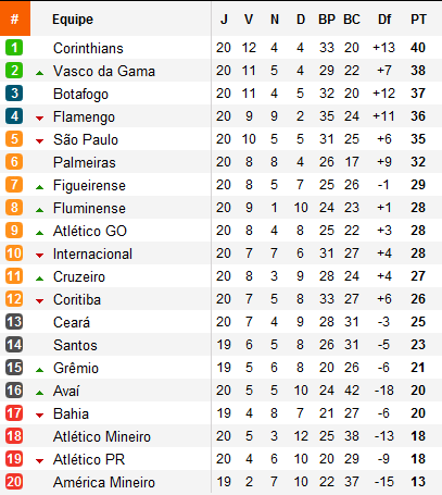 Reste qu’outre le Corinthians, deux outsiders en profitent pour se placer. Vasco, touché par l’AVC de Ricardo (qui semble aller mieux), s’impose chez lui devant Ceará et prend la seconde place à deux points du leader. Vasco est suivi par Botafogo qui écarte un Palmeiras en chute libre et prend la troisième place.