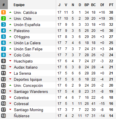 Au terme de la dix-septième journée, on connait les affiches des quarts de finale de l’Apertura chilien au cours desquels la grande question sera de savoir qui pourra empêcher la Católica de décrocher le titre.