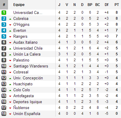 Quatre rencontres et la Católica s’installe déjà. 2 victoires et 2 nuls, les Cruzados mène le bal accompagnés par O’Higgins et Cobreloa. Derrière, la ‘U’ est à trois points alors que Colo Colo se réveille enfin après deux défaites pour débuter dont un catastrophique 0-4 concédé face à Audax en ouverture. Mais la situation la plus délicate et surprenante est pour l’Unión Española. Quatre matchs, quatre défaites, un seul petit but inscrit, les Hispanos ratent complètement leur début de tournoi et se préparent déjà à un terrible choc des derniers face à Ñublense.