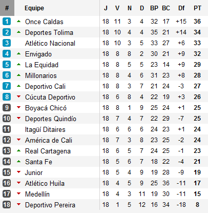 On connait donc le tableau des quarts qui verront le vainqueur de la phase régulière et tenant du titre Once Caldas défier Millonarios, l’Atlético Nacional opposé au Deportivo Cali, Tolima à Cúcuta et Envigado à La Equidad. Matchs aller, ce mercredi.