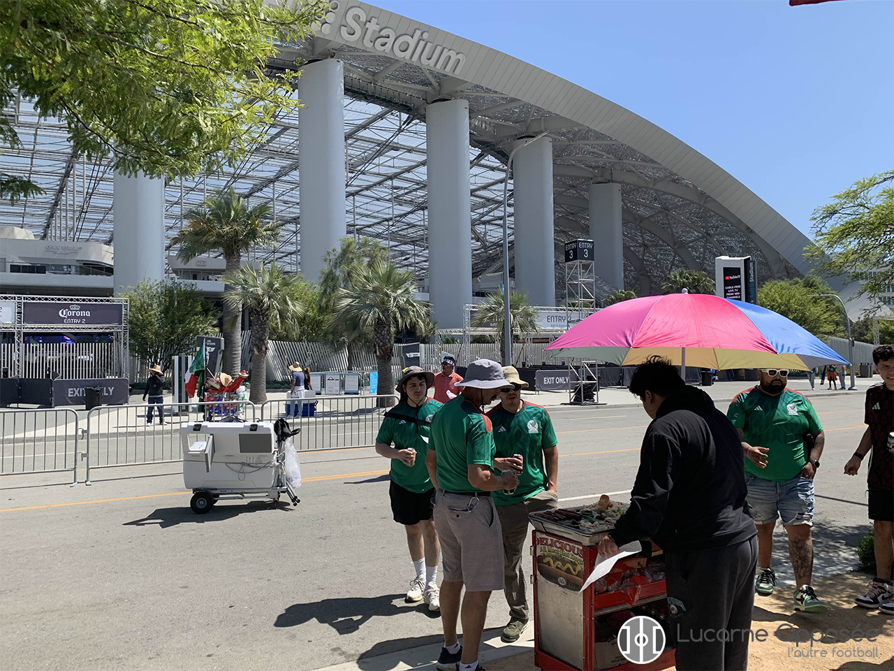 Comme expliqué dans notre premier inside de cette Copa America USA 2024, Los Angeles est une des plus importantes terres du soccer aux États-Unis. La communauté americano-mexicaine vibre pour son attachement à sa sélection le Tri. Malgré des résultats décevants qui s’enchainent et dont l’apogée fut une élimination en phase de groupes à la dernière Coupe du Monde au Qatar, une première depuis 1990 lorsque la sélection avait été privée de Mondial à cause du scandale des Cachirules (une triche à l’âge qui avait exclu le Mexique de toute compétition internationale). Il faut remonter à 1978 pour trouver trace d’une élimination au premier tour d’une Coupe du Monde à laquelle le Mexique participait et cette élimination en phases de groupes a été vécue comme un choc au pays et par sa diaspora, même si elle n’étonnait pas les spécialistes. Ajoutez à cela : le fait que le Tri n’a plus gagné contre son rival historique, les États-Unis, depuis 2019, une éternité et la victoire en Gold Cup 2023 dans ce même stade n’avait pas rassuré ; que son sélectionneur intérimaire devenu titulaire du poste, Jaime Lozano, ne bénéficie plus du soutien des aficionados de la sélection qui l’avaient surnommé Lamborjimmy ; un désamour croissant de la population avec sa sélection, l’appât du gain devenu plus fort pour la FMF que l’amour de ses supporters ayant creusé un fossé, avec une conséquence folle, le Tri a joué deux de ses trente-trois matchs amicaux sur les quatre dernières années au pays. Et voilà comment le Mexique était sous pression face à 72 773, un chiffre supérieur au Superbowl 2022 mais légèrement inférieur à la finale de Gold Cup 2023 (72 963 spectateurs). La passion était donc palpable, l’émotion se faisait sentir auprès des vendeurs de rues et des fans. Un maillot, un taco, un hot dog à la sauce mexicaine, une bière mexicaine, les Mariachis qui jouent leur musique traditionnelle. Le décor était planté pour un match déjà décisif.