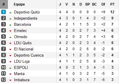 4 matchs, 4 victoires, le Deportivo Quito plane sur la première division équatorienne. Dernier succès en date, celui arraché sur la pelouse du Deportivo Cuenca qui offre désormais trois points d’avance sur la surprise Independiente, vainqueur à la Casa Blanca de la LDU. Avec Barcelona, Emelec et El Nacional déjà en retard, le Deportivo Quito s’offre un départ idéal.
