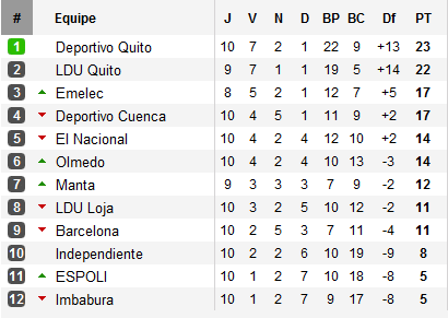 Derrière, le trou est fait. Cuenca, défait ce jeudi par la Liga de Quito chez lui (0-2), est à six points tout comme El Nacional avec qui il avait partagé les points le week-end dernier. Seul absent en haut du tableau, le troisième du classement combiné 2010, Barcelona. Les Toreros n’ont remporté que deux rencontres en dix journées (dernière défaite le week-end dernier à Olmedo (0-4)) et pointent déjà à 12 points du leader, à égalité de point avec l’un des deux promus, la Liga de Loja, champion de Serie B 2010 emmenée par son prolifique buteur brésilien Fabion Renato, actuel meilleur réalisateur du tournoi (8 buts en 10 matchs). Pour l’autre promu, Imbabura, le départ est plus compliqué, les textileros sont actuellement bon derniers du championnat.