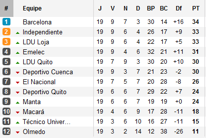 Conséquence, aucun des six premiers ne s’était imposé. Les cartes en main pour s’envoler, Barcelona n’en profitait pas, battu chez lui par El Nacional. Entre Barcelona leader et Deportivo Cuenca sixième, six équipes se tiennent en quatre points alors que la 20e journée du week-end nous offre un Clásico Quiteño de feu et un choc de leaders LDU Loja – Barcelona.
