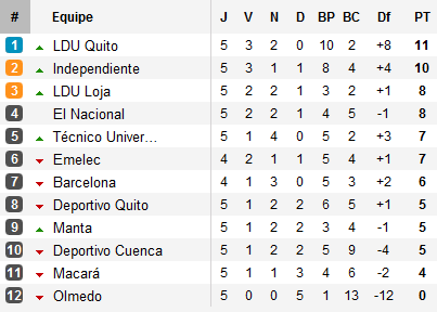 Avec un Claudio Bieler en grande forme (sixième but en cinq rencontres), la LDU conserve la tête du tournoi équatorien. Pourtant, après deux succès dès les deux premières rencontres, les hommes de Bauza avaient été freinés une première fois par le Deportivo Quito avant de se relancer face à Emelec. La sixième journée du week-end dernier offrait à la LDU l’occasion de conserver son avance en tête du classement. Mais un but signé Alex Colon dans les derniers instants permettait au promu Técnico Universitario, à dix contre onze, d’arracher le nul.