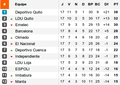 Longtemps le Deportivo Quito a écrasé la Primera Division équatorienne. Invaincu, les Chullas n'avaient aucun adversaire à leur mesure. Mais depuis une défaite dans le Superclásico de Quito, la belle mécanique rouge et bleue semble s'être enrayée. Ainsi, si la 17e journée a vu le Deportivo se relancer enfin en dominant la Liga de Loja (3-0) après deux résultats nuls, pendant ce temps, la LDU s'est rapprochée. Tellement près qu'en dominant El Nacional, l'autre club de Quito reste à six longueurs de son rival local et peut encore croire au titre.