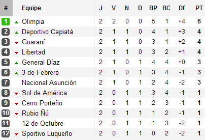 La deuxième journée se déroulait ce week-end avec pour affiche le duel entre Libertad et Cerro Porteño. Soldé par un score nul et vierge, le match ne permet pas au Ciclón de recoller à la tête du classement. La bonne affaire est pour Olimpia qui réalise le sans-faute en s'imposant chez lui devant les Tejedores alors que le Nacional décroche son premier succès, préparant ainsi de la meilleure des façons sa première finale de Libertadores.