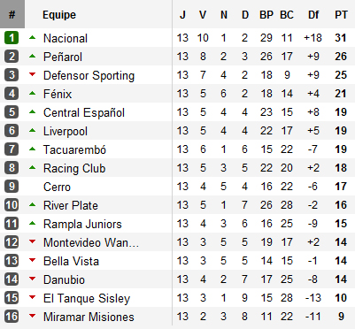 En queue de classement, la relégation est officielle pour Tacuarembó et Miramar Misiones alors que Central Español, Racing, Rampla Juniors et Fénix lutteront pour éviter la dernière place de relégué. 4 points séparent ces cinq équipes.