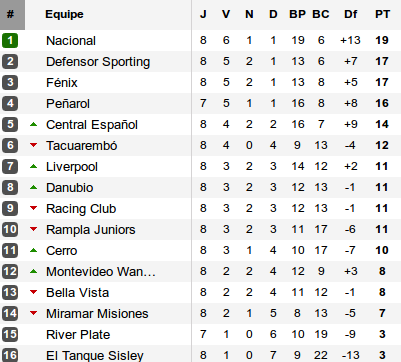 Autres cartons de la semaine, ceux de Central Español devant Rampla Juniors (5-1 quadruplé du meilleur buteur du championnat Cristian Palacios, 20 ans !) et de Peñarol devant Tacuarembó (5-0). Les Aurinegros se replacent à trois points du leader et compte un match de retard. Petit score de la semaine, Fénix s'impose sur le terrain de Miramar Misiones mais grâce à se succès recolle à la seconde place au général.