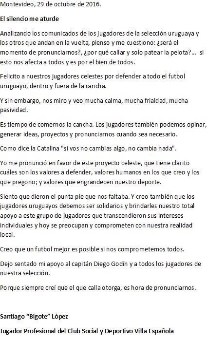 Pour faire suite au communiqué des joueurs de la Celeste, des joueurs du championnat ont eux-mêmes pris leur plume cette semaine. C'est notamment le cas de Santiago Bigote Lopez, attaquant emblématique de Villa Española, qui a écrit ceci :