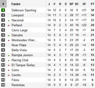 Vainqueur des Wanderers, le Nacional pourra se contenter d’un point lors de l’ultime journée de ce week-end face à Liverpool pour assurer sa première place au classement annuel. L’enjeu est important car le vainqueur de la finale Nacional – Defensor Sporting sera opposé au vainqueur du classement annuel pour l’attribution du titre. Autant dire que les deux équipes trouveront un réel intérêt à s’imposer lors de la dernière journée pour jouer le titre sur un match.