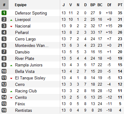 Quatre points d’avance à deux journées de la fin à l’heure de recevoir El Tanque Sisley balayé le week-end passé par River Plate : le Defensor Sporting devrait assurer sa victoire sur le Clausura 2012 dès ce week-end. Mais l’enjeu des deux journées à venir est plus important que cela. Car, si vous êtes des habitués de Lucarne Opposée, vous savez que le titre national se joue au terme de matchs de play-offs entre les deux vainqueurs de chaque tournoi puis, au cas où le vainqueur de ce match de barrage soit différent, lors d’une finale face à l’équipe classée en tête au classement combiné des deux tournois.
