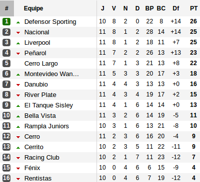 Reste que la Violeta, surnom du Defensor Sporting, assoit sa place de leader en remportant le clásico moderno l'opposant à Danubio, restant ainsi seule équipe invaincue avec un point d'avance sur ses poursuivants directs et un match de retard. Dans les pas du Defensor Sporting, le Nacional de Gallardo s'accroche en s'imposant à Fénix avec notamment le 10e but en 11 matchs pour Richard Porta.