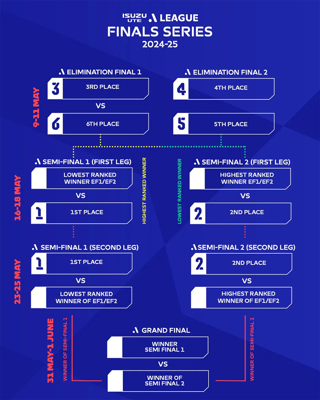 La saison estivale australienne étant un calvaire pour les acteurs du football avec des températures insupportables à la pratique sportive, le calendrier supprime les matchs de 15 heures de décembre à mars. La ligue réintroduit la campagne « L'été du football » du 27 décembre au 27 janvier, avec des matchs en milieu de semaine sur deux journées pendant les vacances scolaires de janvier. La finale du est prévue pour le 31 mai ou 1er juin.