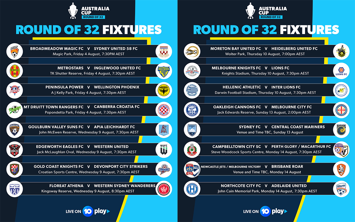 Du côté des clubs de l’élite, Melbourne City FC, finaliste perdant de la A-League Men la saison dernière, sera opposé à Oakleigh Cannons ; Adelaide United, triple vainqueur de l’épreuve, sera opposé à Northcote City, qui évolue en NPL2 dans l'État de Victoria ; Wellington Phoenix se rendra à Redcliffe pour défier Peninsula Power, qui participe pour la quatrième fois à la Coupe d'Australie ; Western Sydney Wanderers se rendra à l'ouest pour rencontrer le Floreat Athena FC, qui fera son retour depuis 2016 ; enfin, Western United affrontera Broadmeadow Magic, club de NPL.