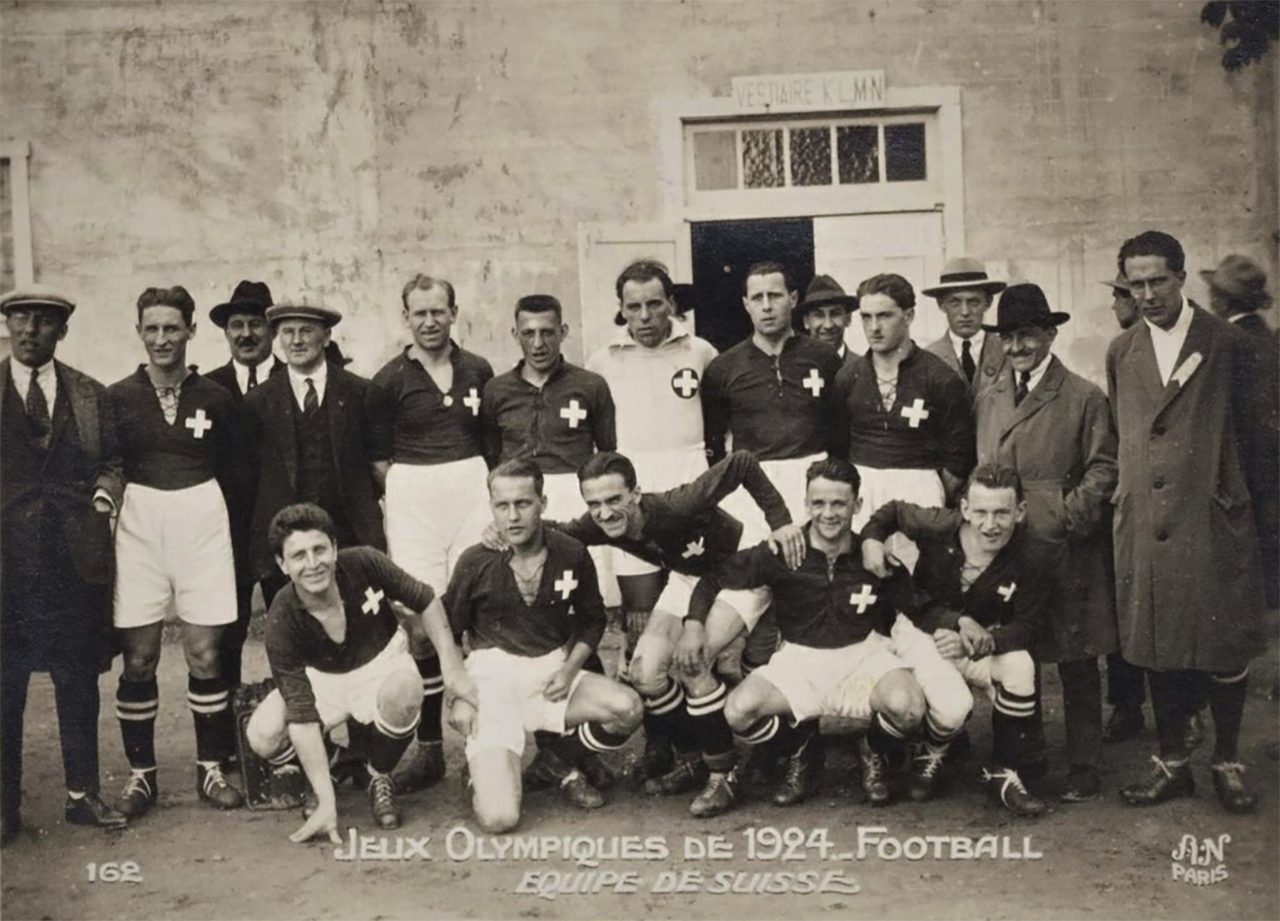 Dans la série des pays « amis » de la France qui se devaient de participer, après la Belgique et le Luxembourg, on retrouve la Suisse. Comme les précédents, il s’agit d’un membre fondateur de la FIFA. Dès février 1924, l’équipe se prépare, « au cours d'un débat sur la préparation en vue des Jeux Olympiques de Paris, il a été décidé que trente joueurs seront invités à suivre un entraînement. […] La Suisse est dirigée par les quatre entraîneurs anglais ». La France se déplace à Genève fin mars pour une rencontre internationale que L’Auto décrit en ces termes : « Le match qui, demain à Genève, mettra aux prises les équipes nationales de France et de Suisse, compte comme l'un des plus classiques de notre calendrier international. Jusqu'à présent, nos voisins et amis n'ont pu prendre l'avantage sur nous et le palmarès des rencontres France-Suisse est très nettement en notre faveur. Avant 1921, les Suisses pratiquaient un football précis et scientifique, mais exagérément lent, et la vitesse et la fougue de nos représentants arrivait presque toujours à vaincre les équipes helvètes qui, pourtant, possédaient une incontestable supériorité technique. Mais, depuis deux ou trois ans les Suisses ont changé leur méthode et ont acquis une rapidité qui a donné à leur jeu une efficacité qui leur manquait totalement. On a vu l'an dernier, à Pershing, que les Suisses ne nous étaient inférieurs à aucun point de vue. Aussi, le match France-Suisse a-t-il gagné en intérêt, du fait de l'incertitude du résultat ». C’est finalement la Suisse qui s’impose, comme un présage du tournoi à venir. Quelques jours plus tard, pour Pâques, les Suisses reçoivent les Danois et les battent 2-0 : « Aujourd'hui, le onze national suisse a remporté une victoire nette et méritée sur l'équipe représentative du Danemark. Les Helvètes marquèrent leur premier but après une minute et demie de jeu et conservèrent constamment le commandement du match. Leur supériorité se traduisit par un second but, qui confirma l'avantage des Suisses. La performance réalisée cet après-midi à Bâle donne grande confiance sur la représentation suisse aux prochains Jeux Olympiques ». La Suisse affronte la Lituanie au tour préliminaire et est grandement favorite. Elle joue « maillot rouge, croix blanche, culotte blanche ».