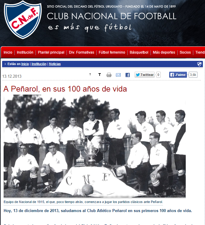 Le 13 décembre 2013, le site officiel du Nacional félicite son rival pour ses 100 ans