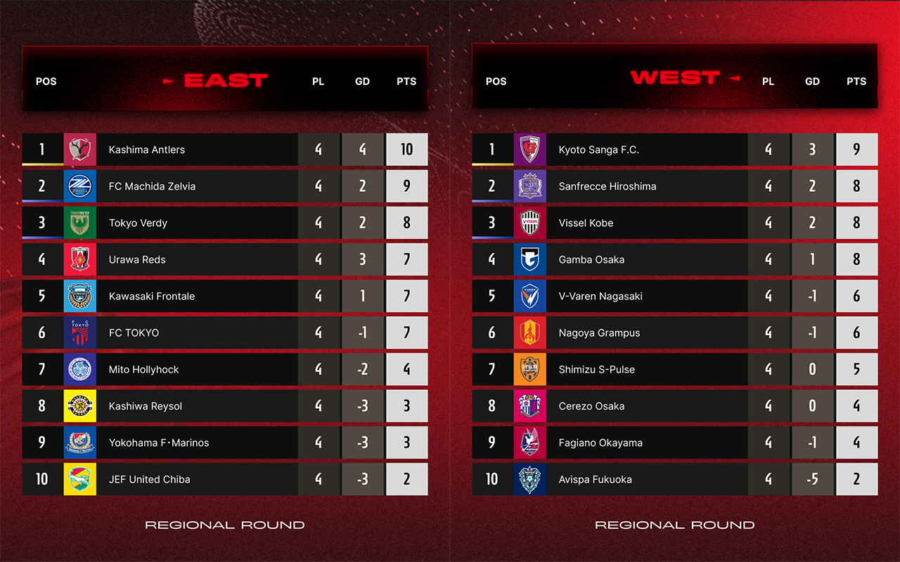 Comme la J1, la J2 et la J3 participent à la 100 Year Vision League, mais sont regroupées, puis les clubs sont séparés en quatre zones. Dans la zone Est A, le Vegalta Sendai domine avec onze points sur douze possibles, devant le relégué Shonan Bellmare et un surprenant Blaublitz Akita. Yokohama FC, également relégué, est à une décevante huitième place. En zone Est B, un trio de tête se détache avec le RB Omiya, club détenu par Red Bull et comptant quatre victoires en quatre matchs. Dans le wagon suivent le Ventforet Kofu, vainqueur de la Coupe de l’Empereur en 2022 et mené par le jeune espoir Yamato Naito, et un très surprenant FC Gifu, club de J3 porté par l’expérimenté gardien espagnol Jon Serantes. Ancien pensionnaire de J1, le Consadole Sapporo est huitième et Fukushima United est lanterne rouge avec treize buts encaissés en quatre matchs, rien de surprenant pour les suiveurs de J3. En zone Ouest A, c’est le petit club de Kochi United qui est premier, profitant d’un revers des favoris Tokushima Vortis et Albirex Niigata, qui sont deuxième et troisième. Enfin, dans la zone Ouest B, le Tegevajaro Miyazaki en est à douze points sur douze. Promu en J2 cet hiver, la dynamique de la montée est encore présente, malgré la blessure de Keigo Hashimoto, meilleur buteur de J3 en 2025. Le Sagan Tosu, favori, est quant à lui en grande difficulté avec une neuvième place et toujours aucune victoire.